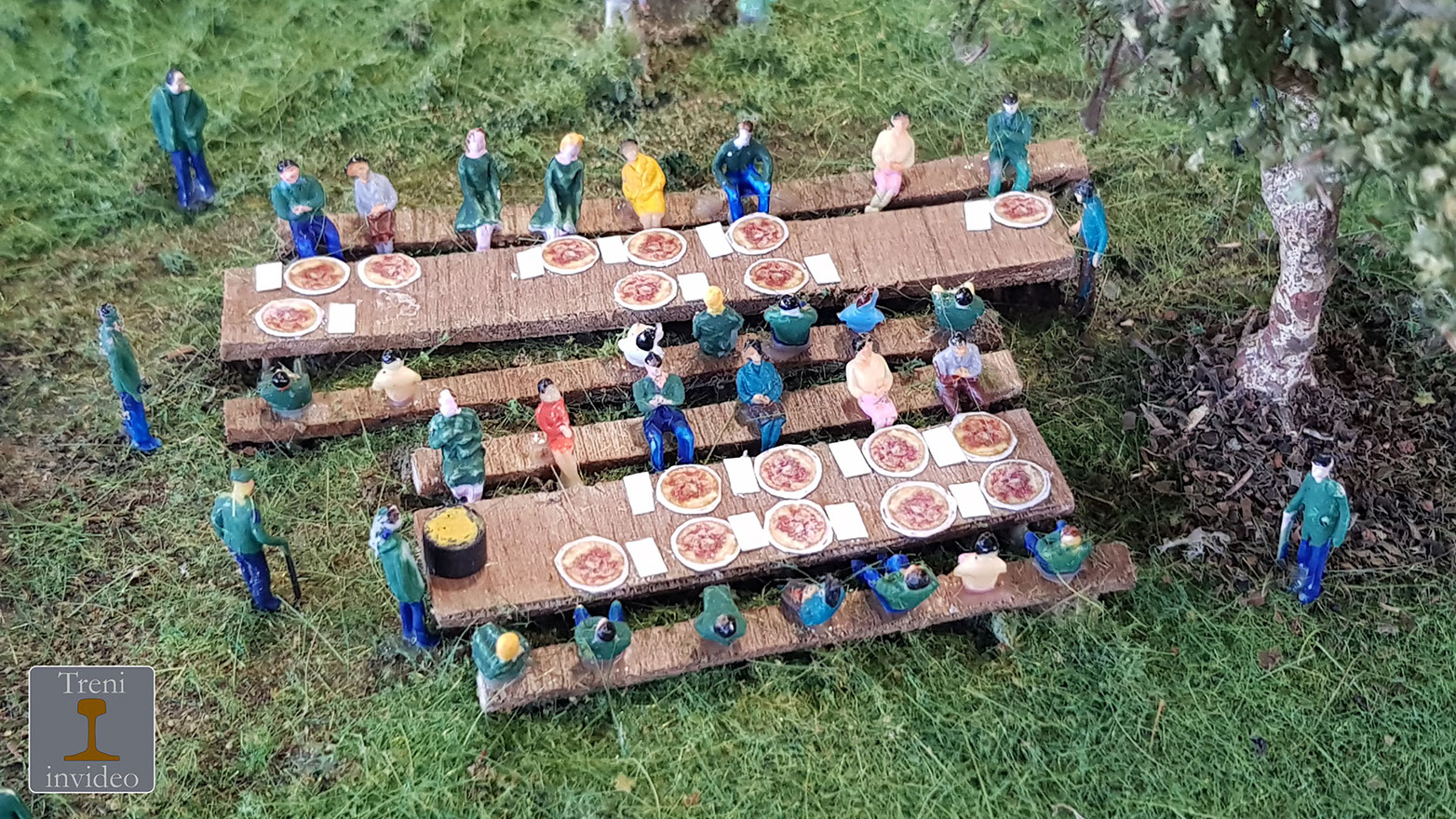 Gli agricoltori in pausa durante il lavoro nei campi hanno organizzato tavolate per una bella pizzata in compagnia